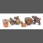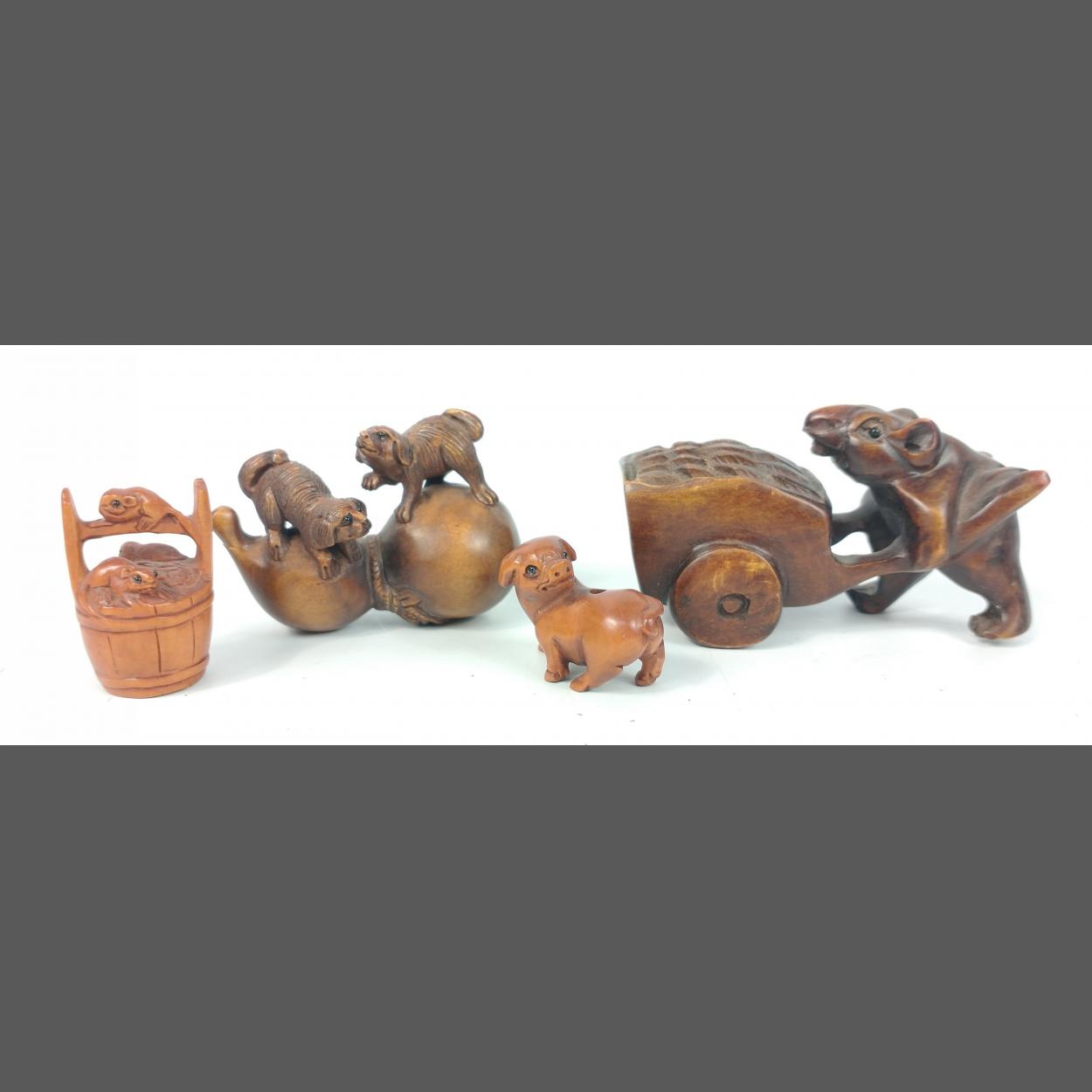 A small collection of carved wooden netsuke to include a mouse pushing a wheelbarrow, a small dog, 2 mice on a basket for a well plus 2 dogs sitting on acorns