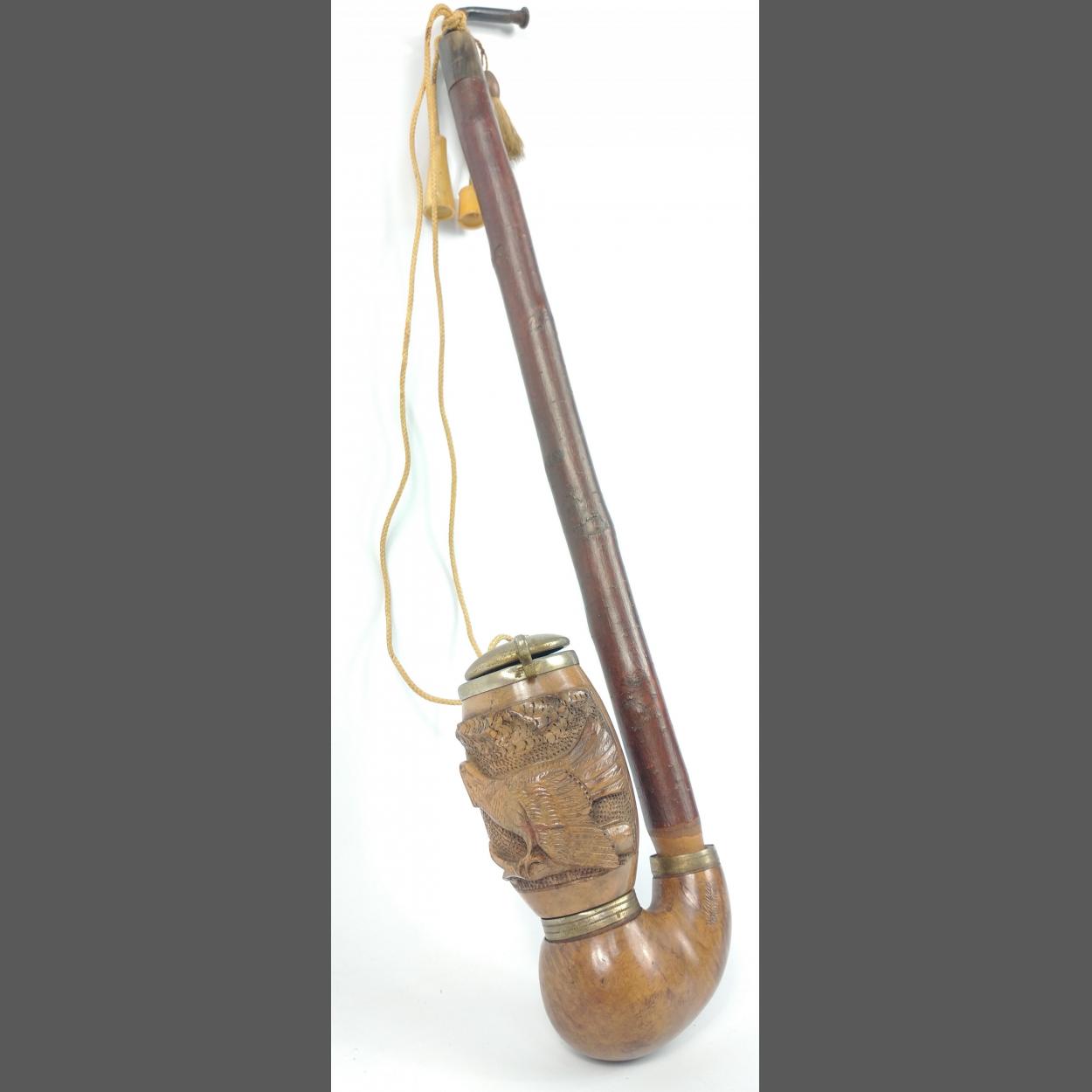 An antique 'Thura', (Bruyere), smoking pipe with a carved capercaillie, white metal lid and metal bands and mouthpiece approx 37cm long