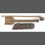 An African tribal gruesome weapon approx 70cm long plus 2 hand-carved hanging wooden ornaments being a face (35cm) and a wooden paddle (55cm)