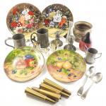 A mixed lot of decorative items to include collectors plates, several pewter tankards, pewter candle holders, Indian brass bowl and others.