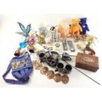 A mixed box to include a small carved and inlaid wooden box, salt clock, Hammersley nautical tankard, pretty 24K highlighted coffee set, two Beanie bears and much else