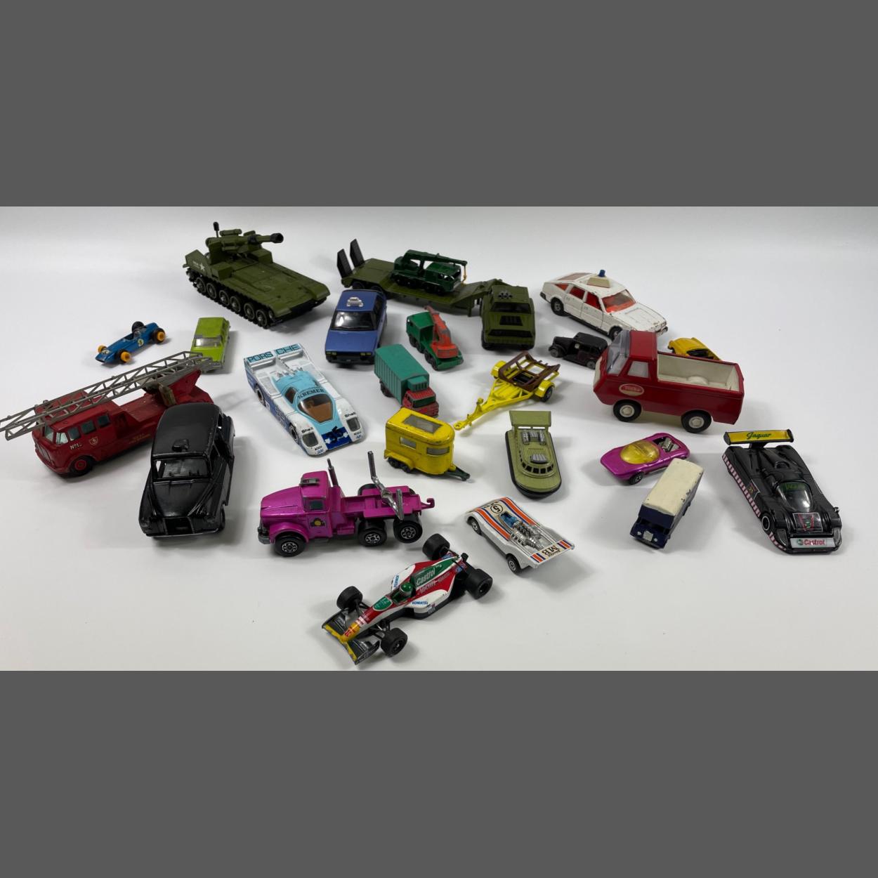 Basket containing old playworn Matchbox Corgi; Dinky toys to include fire engine /tank transporter and F1 Lotus etc