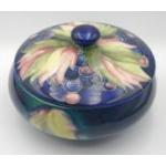 WALTER MOORCROFT jar with lid Impressed stamp mark used with facsimile signature and having ‘Potter to HM Queen’ just under his signature with blue base 9.5cm height x 16cm diameter at widest point approx