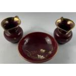 TWO VINTAGE German jugs, approx 12cm high, wine coloured with gilt rim and handle and a pattern of gold-coloured stars plus a 17cm approx wine coloured bowl with gilt rim and flower design interior standing on 3 legs handmade by FOHR KERAMIK.