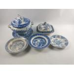 A collection of antique blue and white stoneware to include a lovely lidded soup tureen and covered dish with three plates