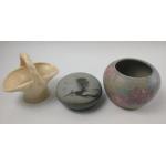 A small CROWN DUCAL flower basket 11cm high, a charming studio pottery pin box and a pot (approx 8cm) by CAROL WYNNE MORRIS