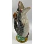 ANTIQUE Wedgwood pottery style small olive green highly decorative jug with applique fruits and leaves dimensions height 11cm x 7.5cm approx wide at widest point with also an equally old ceramic stem vase with white applique grapes and hand painted in blue dimensions 16cm tall x 7cm diameter at widest point