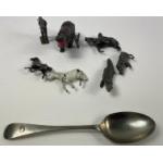 LOCAL INTEREST LOT ! Small collection of 7 vintage lead animals including a crocodile and a hippo A/F plus a memory of Peebles - a dessert spoon from the March Street mill canteen