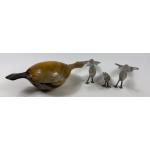 An unusual lot - 3 white metal PHEASANTS (2 at approx 20cm and one at 12cm) and a QUAICH (13cm)