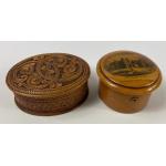 A nice example of COLLECTABLE MAUCHLINE WARE lidded box depicting HOLYROOD PALACE AND EDINBURGH CASTLE ON THE SIDE DIAMETER 8cm x 5cm depth with also a nice carved oval lidded pill box length 10cm x width 8cm