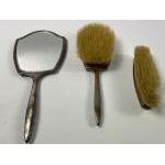 A nice vintage silver enamelled dressing table set with very slight damage to the corner of the hand mirror in green enamel