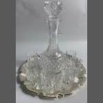 A nice cut glass decanter with stopper and 6 small shot style glasses and a nice white metal tray