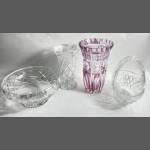 Three fine examples of crystal to include a vase (18cm high), a handled bonbon dish (18cm high), and a lovely bowl (19cm dia), plus a fine cranberry cutglass vase (21cm) tall