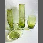 Four pieces of vintage green CAITHNESS GLASS to include a BOWL (14cm high) with design of flowers, a vase (18cm high) with a design of a stag, a vase (25cm high) with a design of a bird and a vase (30cm high) with a design of a tree and leaves