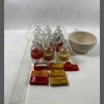 BOOM! Box of 12 chemistry bottles and glassware to include 13mm glass tubes, various sized funnels etc