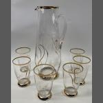 A 1960's glass tumblers and water jug set with gilt pattern and edging