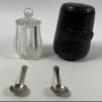 A travelling VINTAGE cut-glass condiment or mustard pot within a shaped leather case height 7cm x 4cm diameter