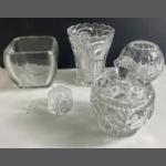 A mixture of CRYSTAL and CUT-GLASS VASES to include a round vase @ approx 10cm high, a crystal vase at approx 15cm, a squarish glass vase @ approx 11cm as well as a cut-glass bonbon dish @ approx 15cm, and a small ink pot