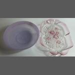 A large SHALLOW BOWL in an attractive lilac colour approx 30cm diameter plus an ornate glass dish in shades of pink with a floral decoration approx 40cm long.