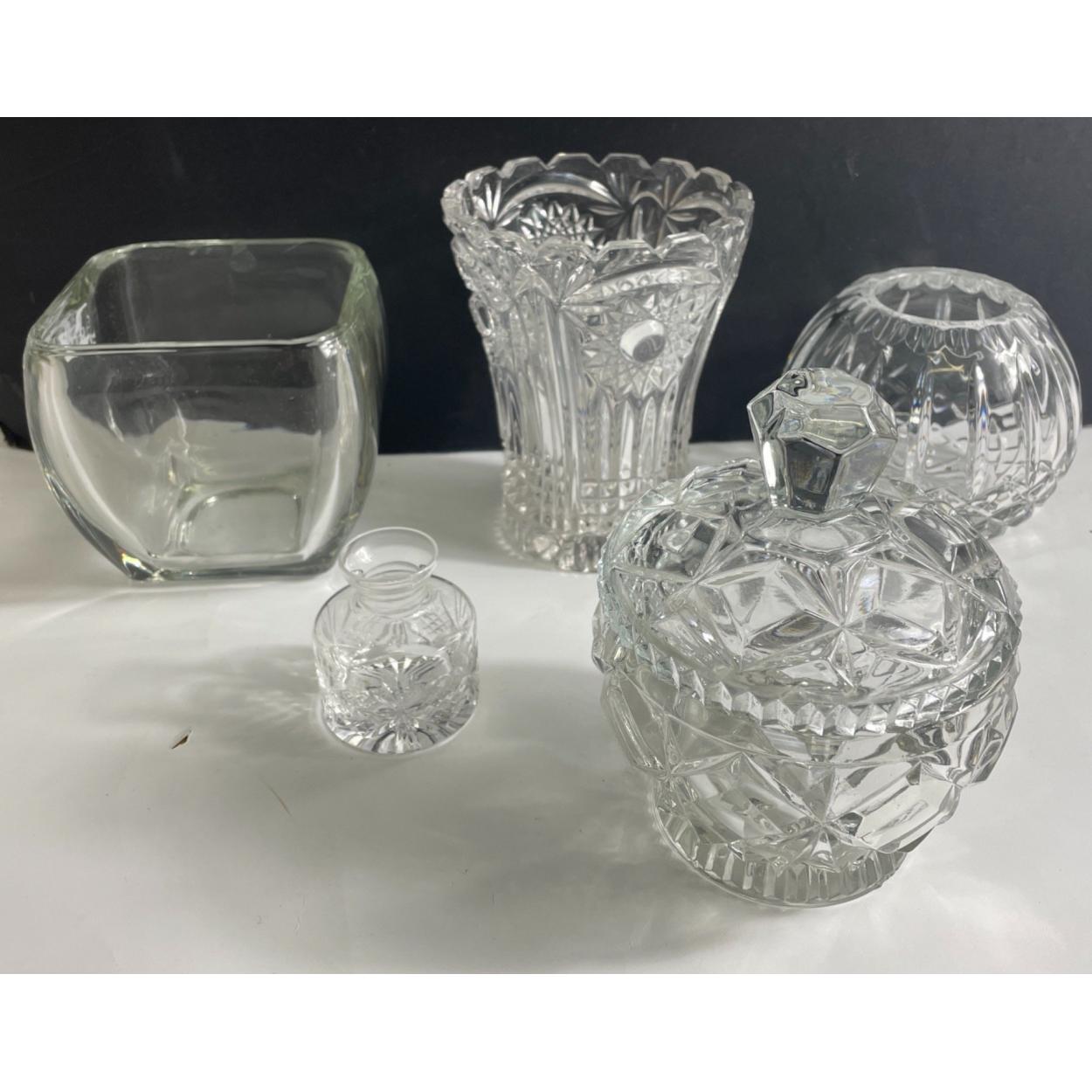 A mixture of CRYSTAL and CUT-GLASS VASES to include a round vase @ approx 10cm high, a crystal vase at approx 15cm, a squarish glass vase @ approx 11cm as well as a cut-glass bonbon dish @ approx 15cm, and a small ink pot