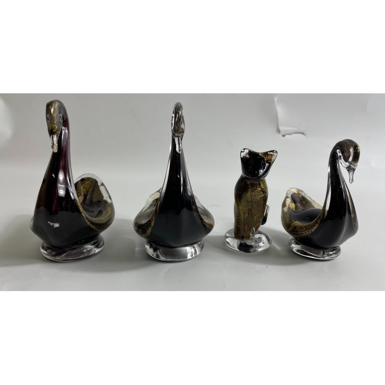 A small collection of three beautiful GLASS SWANS in black with gold highlights, the tallest approx 12cm plus a sitting cat approx 8cm high