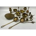 A mixed lot of BRASS ITEMS to include a CHESTNUT ROASTER, various decorative items - bowls, candlesticks etc.