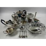 A mixed lot of metalware, mainly EPNS, to include a large WALKER & HALL of Sheffield teapot inscribed "Turnbull-McCutcheon 1891 26th June 1916 from "the Bestman" and his Family with every good wish", a FALSTAFF silver plate teapot and hot water pot (lid needs repair), an octagonal BUTLER of SHEFFIELD TAZZA with handle (20cm approx), an SJL & Co oval dish (30cm dia) with handle resting on four feet etc etc