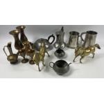 A mixed BRASS and PEWTERWARE lot to include two galloping horses (13cm high), a model brass gear knob (11cm), a pair of decorated brass vases (18cm high), a PEWTER TEA SERVICE to include teapot, coffeepot, milk and sugar etc