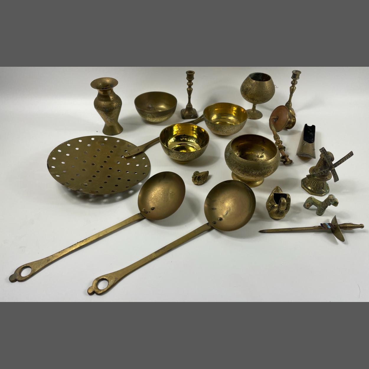 A mixed lot of BRASS ITEMS to include a CHESTNUT ROASTER, various decorative items - bowls, candlesticks etc.