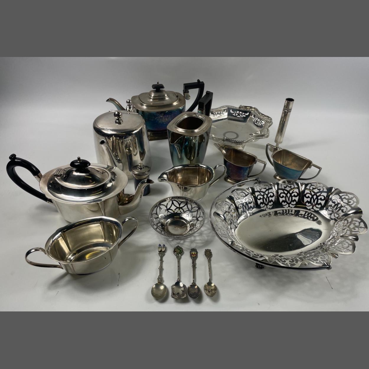 A mixed lot of metalware, mainly EPNS, to include a large WALKER & HALL of Sheffield teapot inscribed "Turnbull-McCutcheon 1891 26th June 1916 from "the Bestman" and his Family with every good wish", a FALSTAFF silver plate teapot and hot water pot (lid needs repair), an octagonal BUTLER of SHEFFIELD TAZZA with handle (20cm approx), an SJL & Co oval dish (30cm dia) with handle resting on four feet etc etc