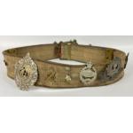 Of military interest - a belt with fourteen badges and buttons including a BRITISH LIGHT INFANTRY "JELLALABAD" cap badge, a WW1 Royal Artillery 'Ubique Quo Fas Et Gloria Ducunt' cap badge, a ROYAL PIONEER CORPS Cap Badge 'Labor Omnia Vincit' badge, a WW1 SOUTH WALES BORDERERS EGYPT Badge, a WW1 ARGYLL AND SUTHERLAND HIGHLANDERS REGIMENT cap badge, a 13th/18th ROYAL HUSSARS Regiment cap badge - Queens Crown, a WW2 Royal Tank Regiment cap badge 'Fear Naught', a RANGOON VOLUNTEER RIFLES Highland Company cap badge, a ROYAL ARMY MEDICAL CORPS cap badge, a CAMERONIANS (Scottish Rifles) badge, a ROYAL ENGINEERS WW1 Royal Engineers Corps (George V) Cap Badge, a ROYAL ARMY ORDNANCE CORPS RAOC WW2 cap badge
