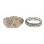 A 375 Birmingham Hallmark stamped studded with diamante chips ring size M gross weight 2.47g gross - with also a gents signet ring size X 375 Hallmark Birmingham stamped with a small diamond(tested) gross weight 4.76g