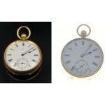 An 18ct LONDON HALLMARK stamped pocket watch in exceptional condition gross weight 83g approx 4.5cm diameter - the watch was ticking away quite happily on valuation!