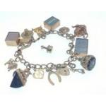 A 375 stamped gold charm bracelet weight 40.10g gross to include a white gold small kettle 9ct stamped charm - this includes the Scottish x3 agate stones and the paper £1 £5 and £10 notes sign on both sides of the charms - weight gross 40.10g