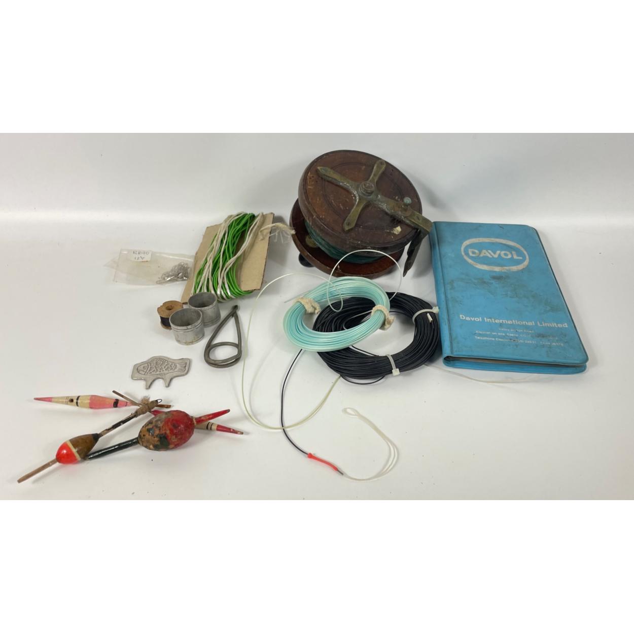 A NOTTINGHAM style 5" antique wood and brass fishing reel plus various fishing equipment including reels and flies