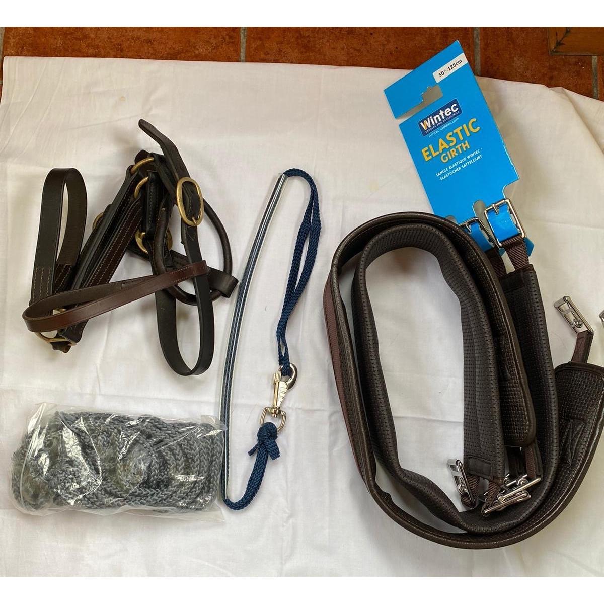 EQUESTRIAN INTEREST - A mixed box FULL to include two 50" synthetic girths - both brand new! WINDTEX & DEVA brands, also a full size handmade leather DEVA branded head collar(TOP QUALITY!) - Also a bag of FILLET STRINGS , heavy fillet-line, all mostly brand new items - all for a full sized horse £200 approx new!
