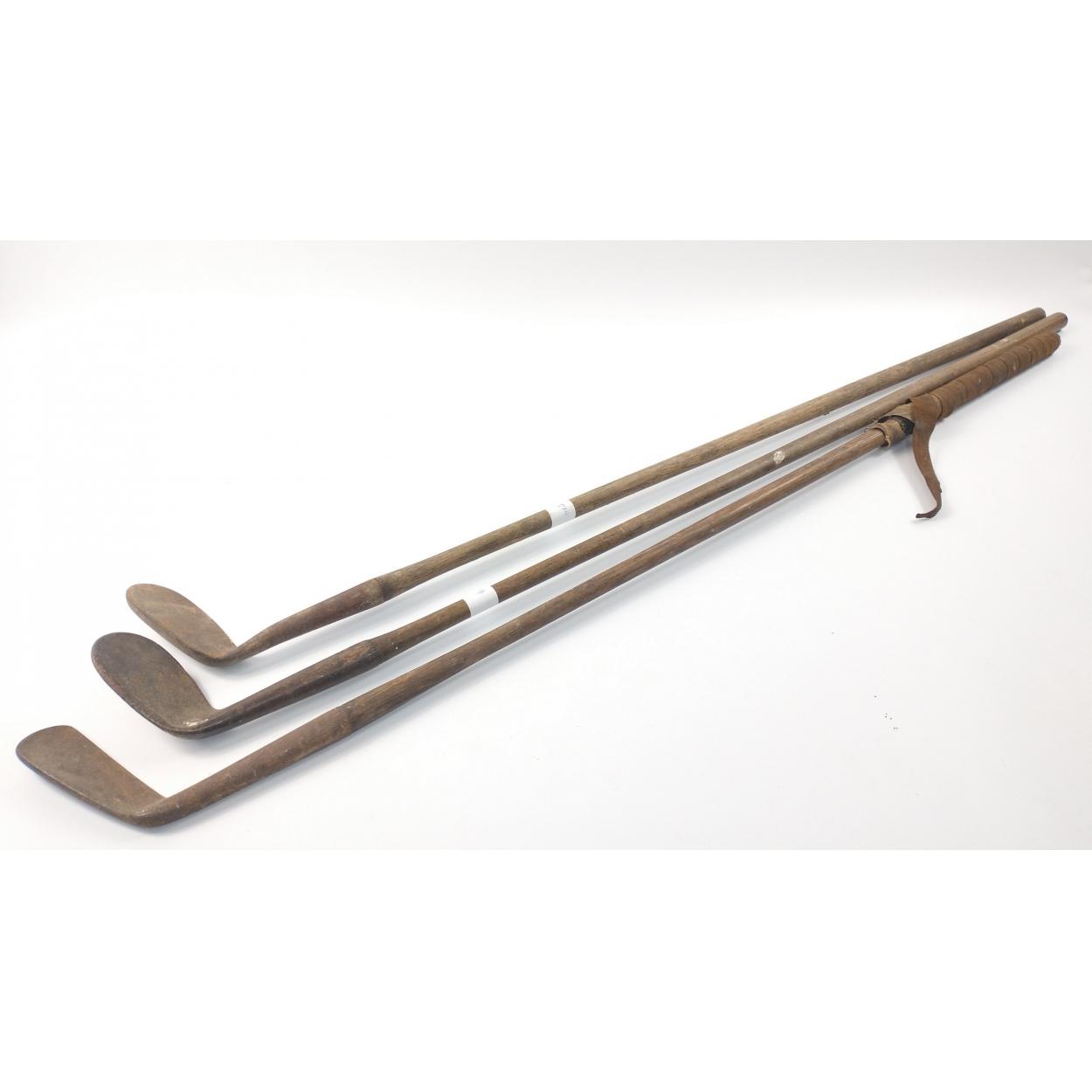 Three very old hickory shafted golf clubs no identifying marks remaining