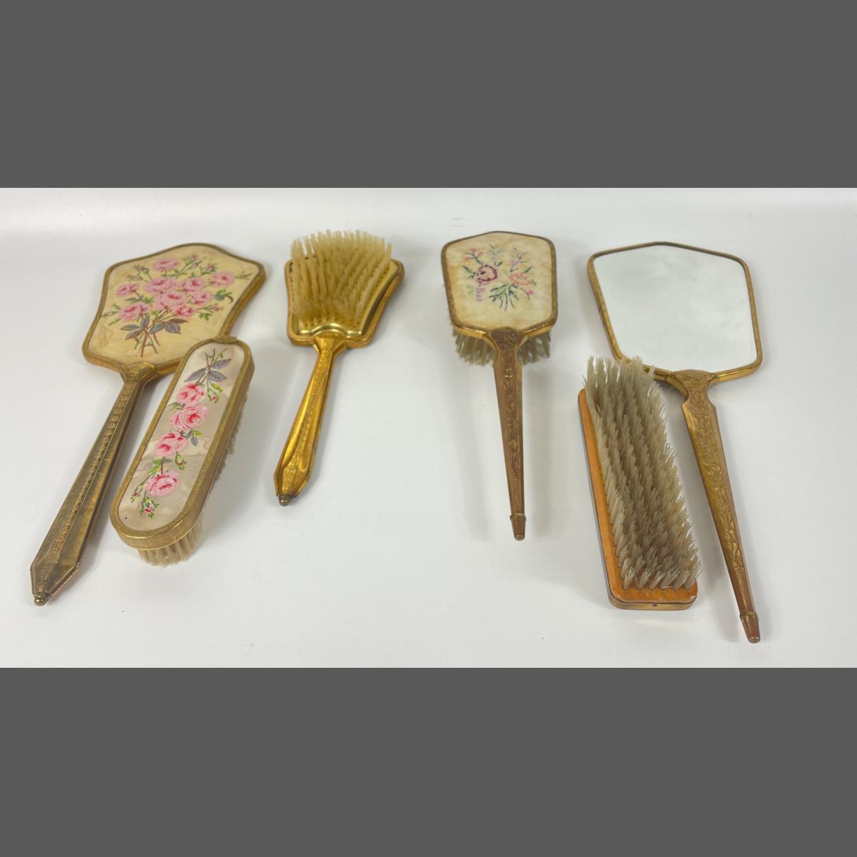 Two dressing table sets of brush, mirror and clothes brush, one with hand-embroidered flower design