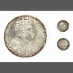 1902 Edward VII, a silver coronation medal in good condition with two silver threepences 1836 and 1889