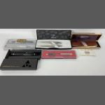 A collection of pens to include a PARKER Jotter set of ball point pen and pencil in original box, a Royal Challenge Parker pen, a PROARC Parker pen, a FERRAZ fountain pen, and a 12K GF boxed SHAEFFER pen