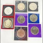 A collection of medals and commemorative coins to include the Queen's 1953 Coronation medal (without ribbon), a Butlins Beaver medal 1953, a 1953 five shilling coin, 3 silver jubilee crowns, 2 Charles and Diana 1981 commemorative crowns,