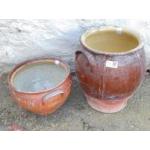 Two outdoor garden ceramic containers largest size 30cm height, 28cm diameter, the smaller one is 20cm H and 29cm diameter