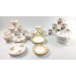A Vintage DORCHESTER floral patterned Fine Bone China teaset 8 cups, 6 saucers and 6 small side plates with a part WEDGWOOD Fine Bone China 3 cup, 3 saucer and 3 sideplates set with also a 6 cup unnamed teaset with a floral bouquet pattern, includes 6 side plates and 6 saucers