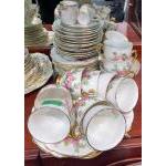A STANLEY tea service comprising 11 cups, 12 saucers, 12 tea plates, 1 milk jug, 1 sugar bowl and 2 sandwich plates plus a white with gilt decoration teapot with its own stand (spout damage repaired) and matching hot water jug with metal lid (18cm high) etc