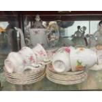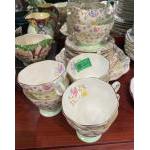 A FOLEY bone china 21 piece tea set No. 2398 pretty floral pattern with green trim comprising 6 cups, 6 saucers, 6 tea plates, 1 milk jug, 1 sugar bowl, 1 sandwich plate, no chips, cracks or signs of damage repair
