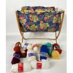 A foldaway fabric knitting bag with a selection of yarn 38x36cm