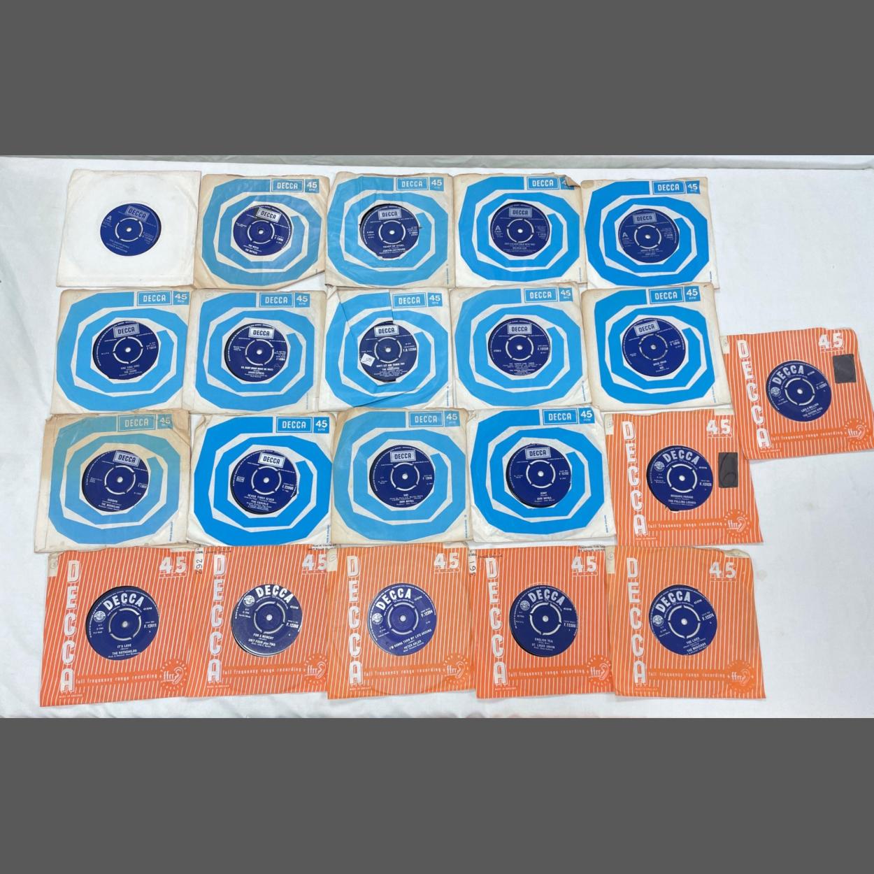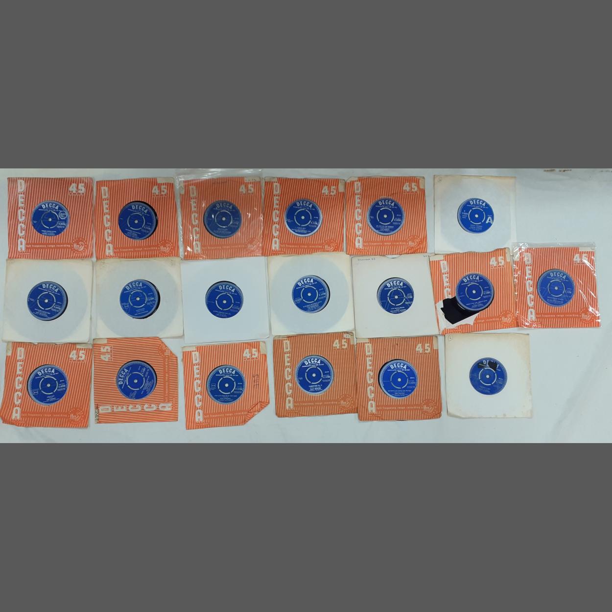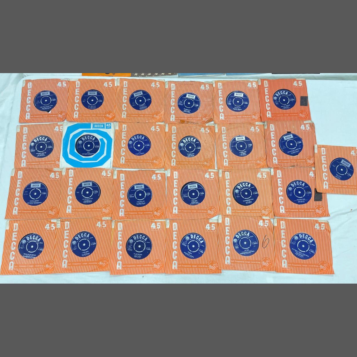 An interestingly eclectic selection of DECCA 45RPM singles lot of over twenty vinyl discs from the 1960s by lesser known artists such as Johnny B. Great and The Goodmen, The Beat Boys, Tom Courtenay, The Moontrekkers, The Robinson Crew, and Billy Fury among many others.