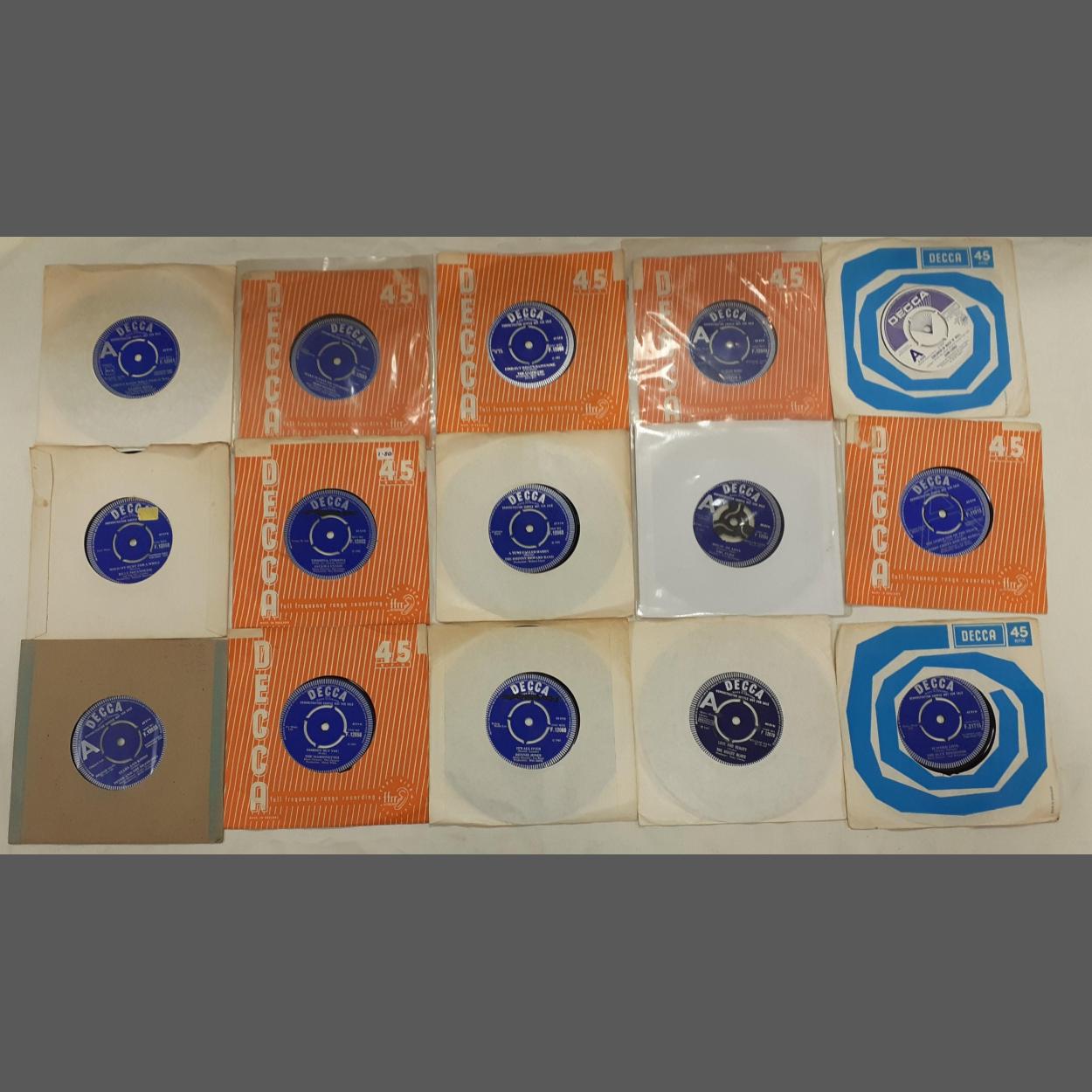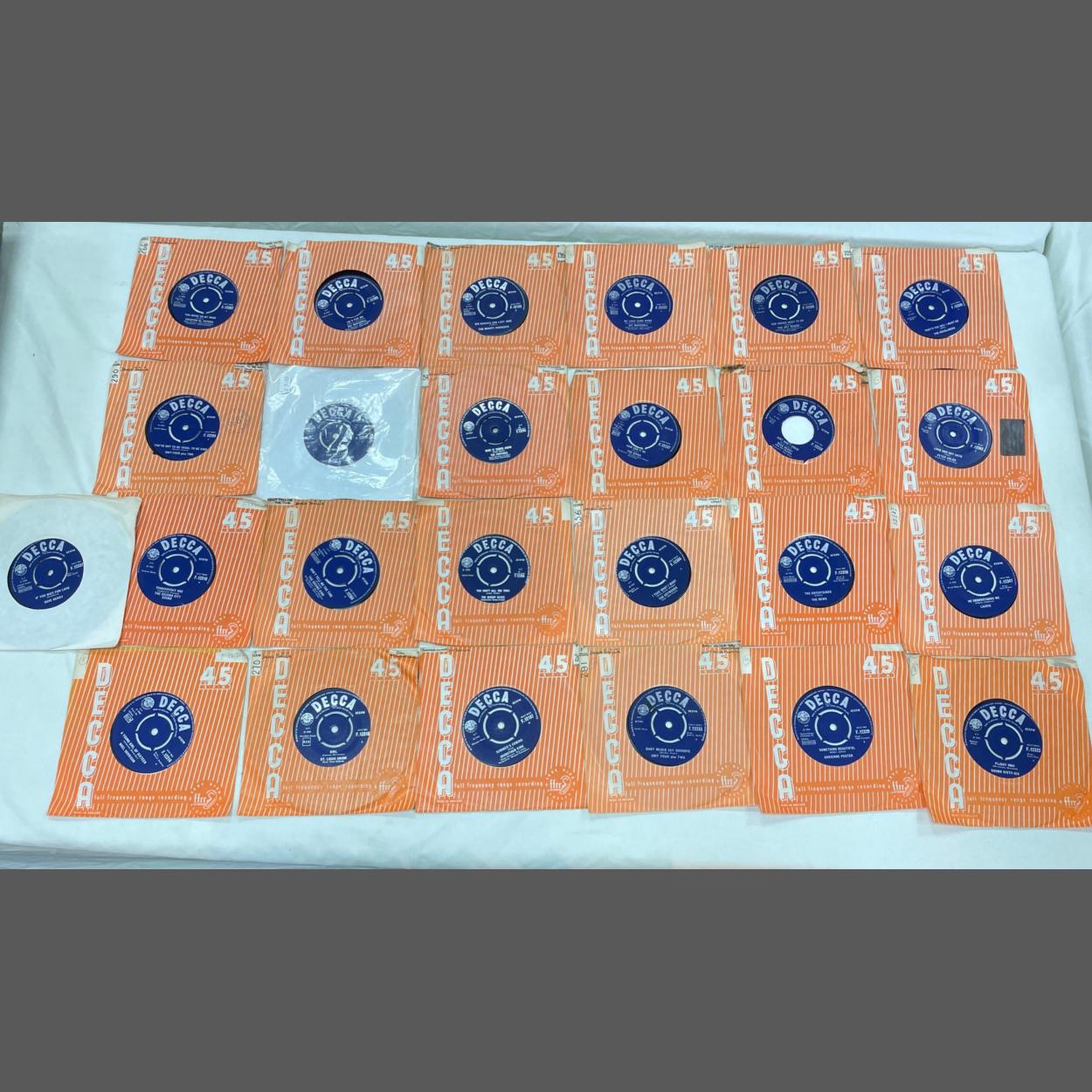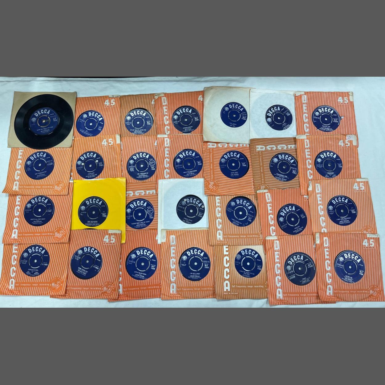 An interestingly eclectic selection of DECCA 45RPM singles lot of over twenty vinyl discs from the 1960s by lesser known artists such as Johnny B. Great and The Goodmen, The Beat Boys, Tom Courtenay, The Moontrekkers, The Robinson Crew, and Billy Fury among many others.