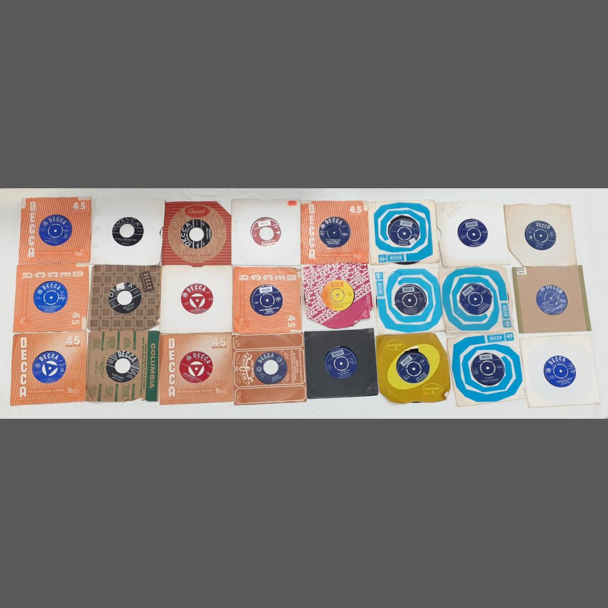 An eclectically interesting selection of DECCA 45RPM singles lot of over 25 vinyl discs from the 1960s by lesser known artists such as The Zephyrs, Burr Bailey and The Six Shooters, Screaming Lord Sutch, Peter Jay and The Jaywalkers, The Chucks and Don Charles among many others.
