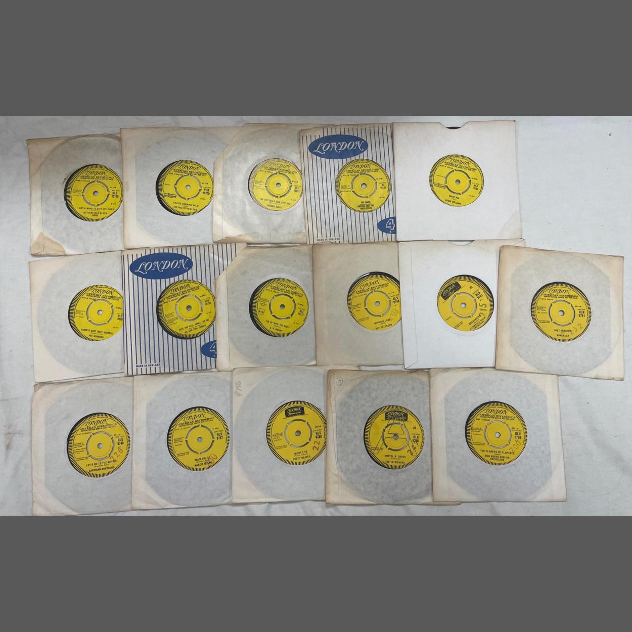 An interesting selection of under-rated artists of 15 LONDON AMERICAN RECORDINGS YELLOW LABEL - LONDON DOT - Demonstration Sample Not For Sale - 45rpm vinyl records from the 1960s to include Jimmy Gilmer and The Fireballs, The Mercy, David Box and Joe Henderson among others.